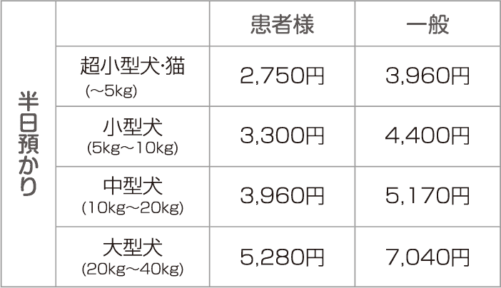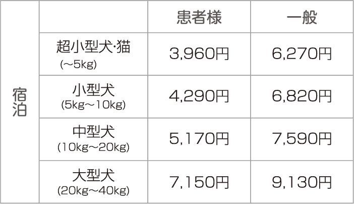 - お預かり中に発生した不慮の事故、ケガ等は治療致します。その際の治療費は飼い主様負担となりますのでご了承ください。